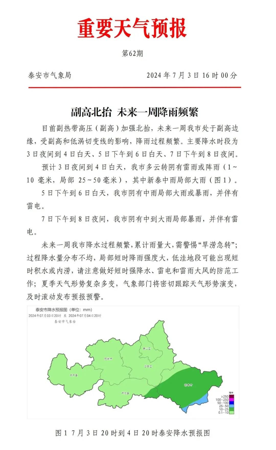 目前副热带高压(副高)加强北抬,未来一周泰安市处于副高边缘,受副高和低涡切变线的影响,降雨过程频繁。主要降水时段为3日夜间到4日白天、5日下午到6日白天、7日下午到8日夜间。