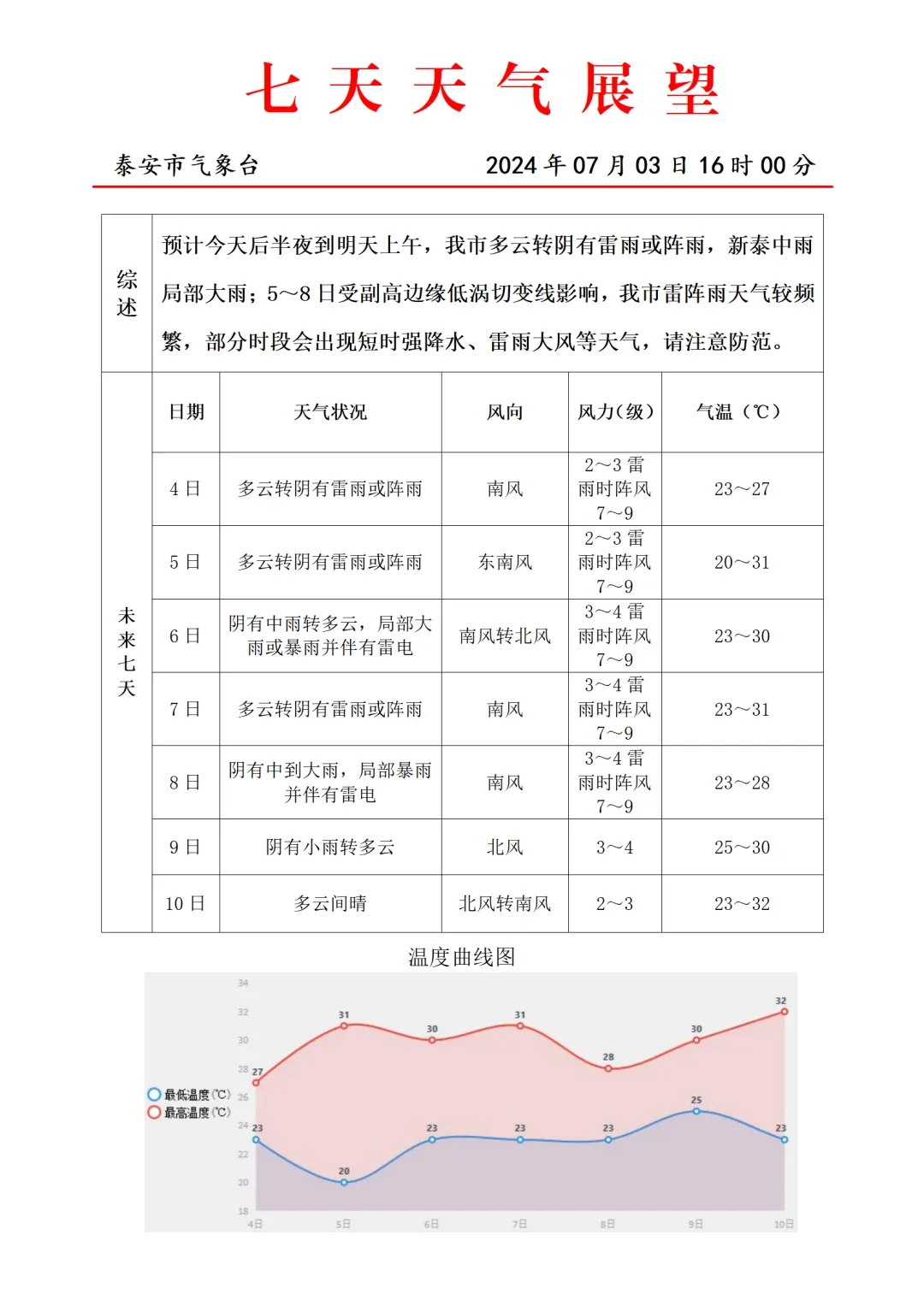 未来一周泰安市降水过程频繁,累计雨量大,需警惕“旱涝急转”;过程降水量分布不均,局部短时降雨强度大,低洼地段可能出现短时积水或内涝,请注意做好短时强降水、雷电和雷雨大风的防范工作;夏季天气形势复杂多变,气象部门将密切跟踪天气形势演变,及时滚动发布预报预警。