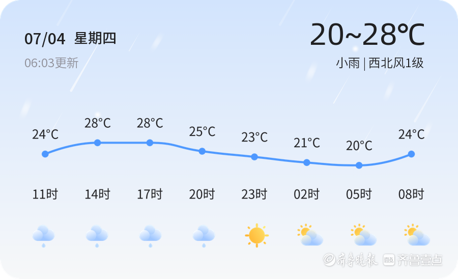 2024年7月4日,农历五月廿九,今日菏泽迎来小雨天气,气温在20℃至28℃之间波动。全市各区均受到小雨的影响,市民出行需携带雨具,注意防雨防滑。西北风1级,空气湿度高达94%,PM2.5指数保持在40,空气质量较为良好。
