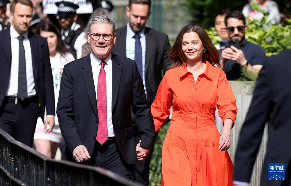 4日,在英国伦敦,英国工党领导人斯塔默(前左)与妻子前往一处投票站,准备投票。