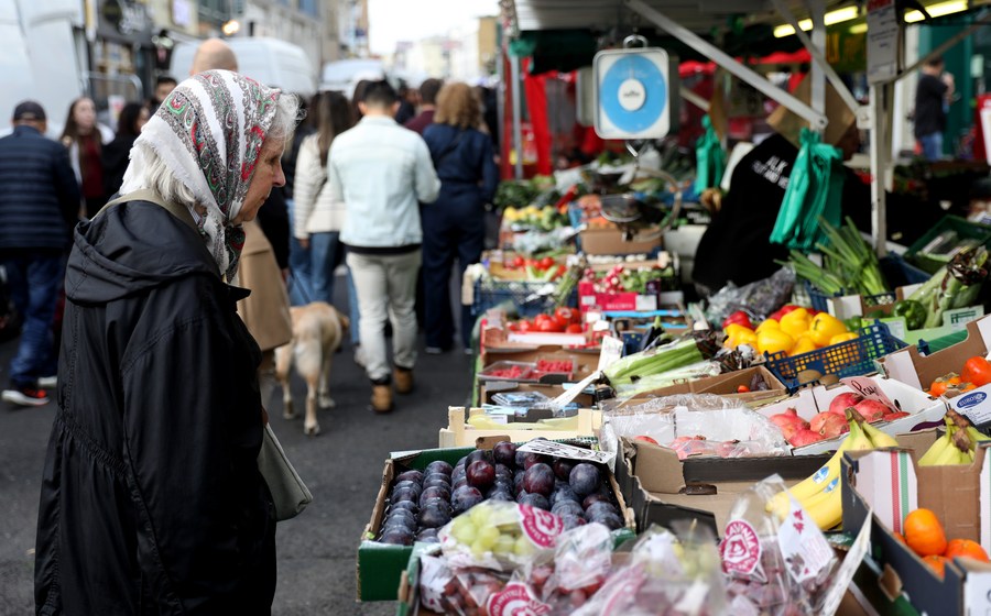 2022年10月,一名女子在英国伦敦波托贝洛市场选购蔬果。