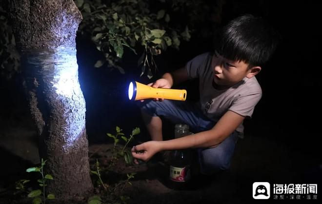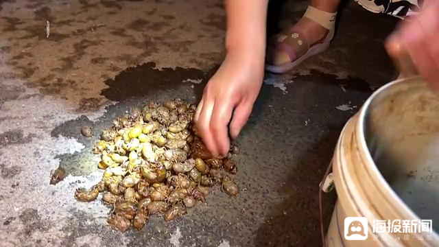 “入伏前后20天是金蝉破土的爆发期,一般在每晚8点到10点这个时间段就都爬出来了。”村民冯洪花左手拿着手电筒,右手提着塑料桶,正在刚下过雨的自家果园里深一脚浅一脚寻找金蝉的身影。