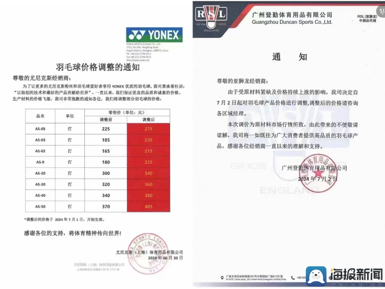 近期,多家羽毛球品牌发出涨价通知。