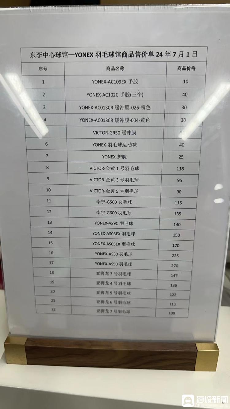 青岛市民傅先生向记者提供的球场内各羽毛球的价目表。