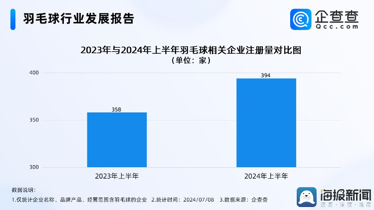 企查查数据显示,我国现存羽毛球相关企业1.3万家,截至目前,今年已注册相关企业411家,其中上半年注册394家,同比增长10.06%。业内人士分析,行业供需失衡,部分反映了国内羽毛球爱好者的壮大,对于羽毛球运动陡然走红,有网友认为,其和掼蛋一样,是扩展职场人脉的社交需求,对此有人戏称“下次打羽毛球记得带简历”。