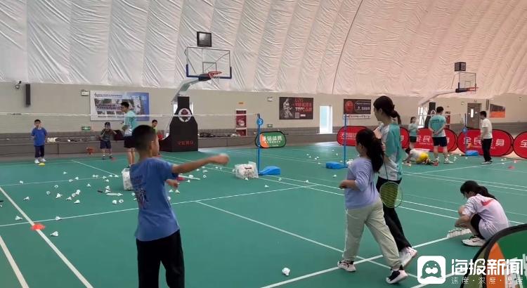 济南凤凰山沃克篮球公园内的羽毛球馆内,许多小朋友正在进行羽毛球训练。