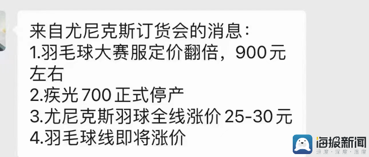 该业内人士向记者提供的订货信息截图中看到,7月3日,尤尼克斯品牌全线涨价25元至30元,同时,羽毛球线也即将迎来涨价。