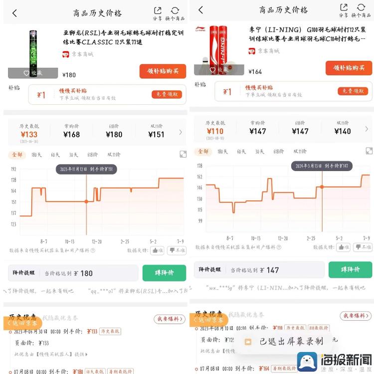 慢买买比价软件上显示,多款羽毛球网上零售价格出现涨价情况。