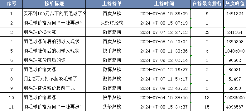 据齐鲁蛙眼舆情大数据平台监测显示,自7月1日至7月10日10时,关于“羽毛球涨价”话题的全网信息量高达4万条,形成11个话题热搜。
