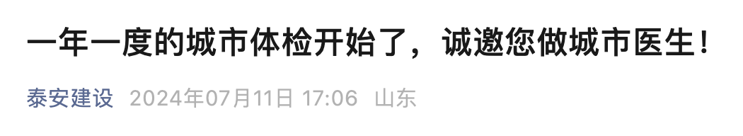 城市是我家,共建靠大家。城市和人一样,也需要定期体检,泰安市2024年度城市体检工作开始了。为发现城市建设发展的不足与短板,诚邀广大市民积极参与问卷调查,共同努力精准查找“城市病”,让我们的城市变得越来越好!