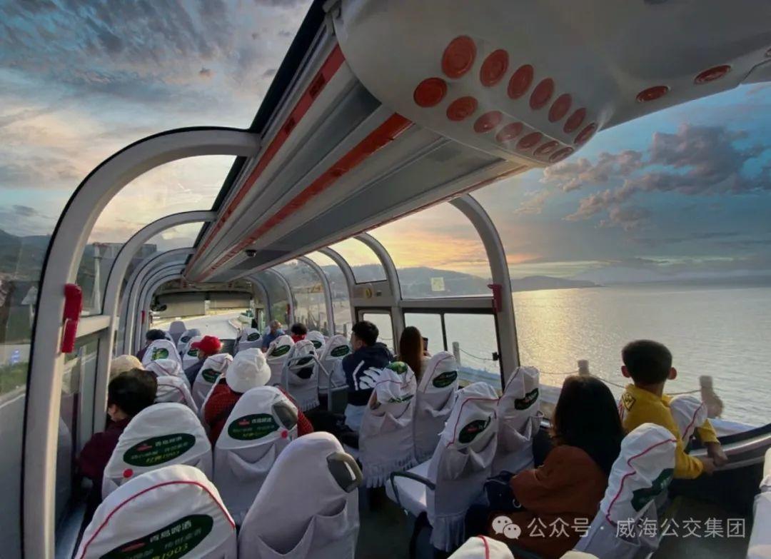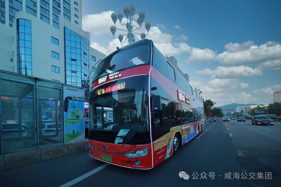 穹顶天窗的大视野,宽幅高背座椅,靓丽的红色车身,辅以大海、日出、鲸鱼、海滩等极具威海城市特色的设计元素,乘一辆高颜值的双层观光巴士,穿梭于城市之间,一侧是高楼林立,一侧是碧海蓝天,配备智能讲解服务,了解眼前风景、背后历史、城市发展,开启一段发现威海、走近威海的难忘旅程。