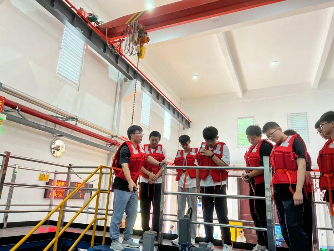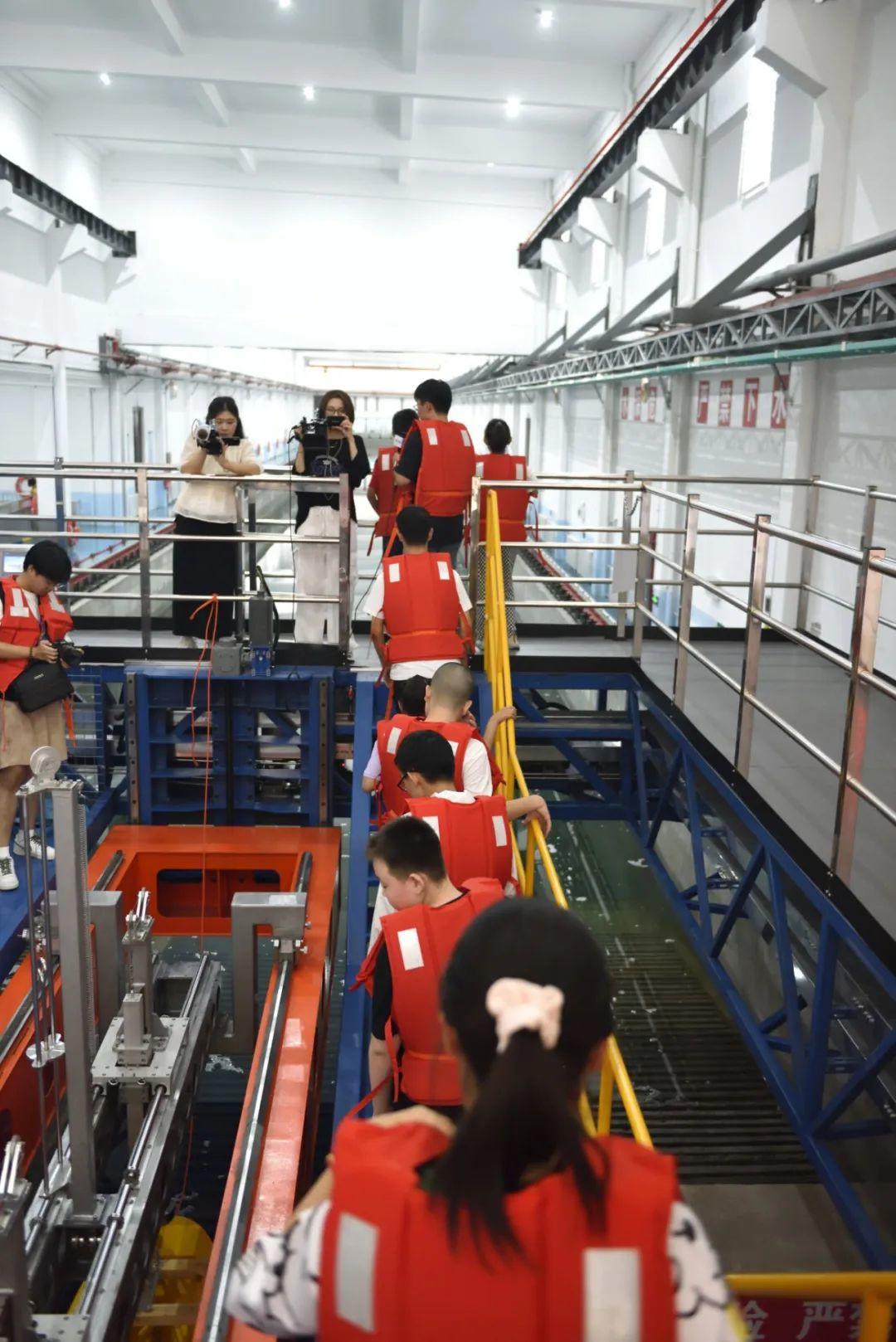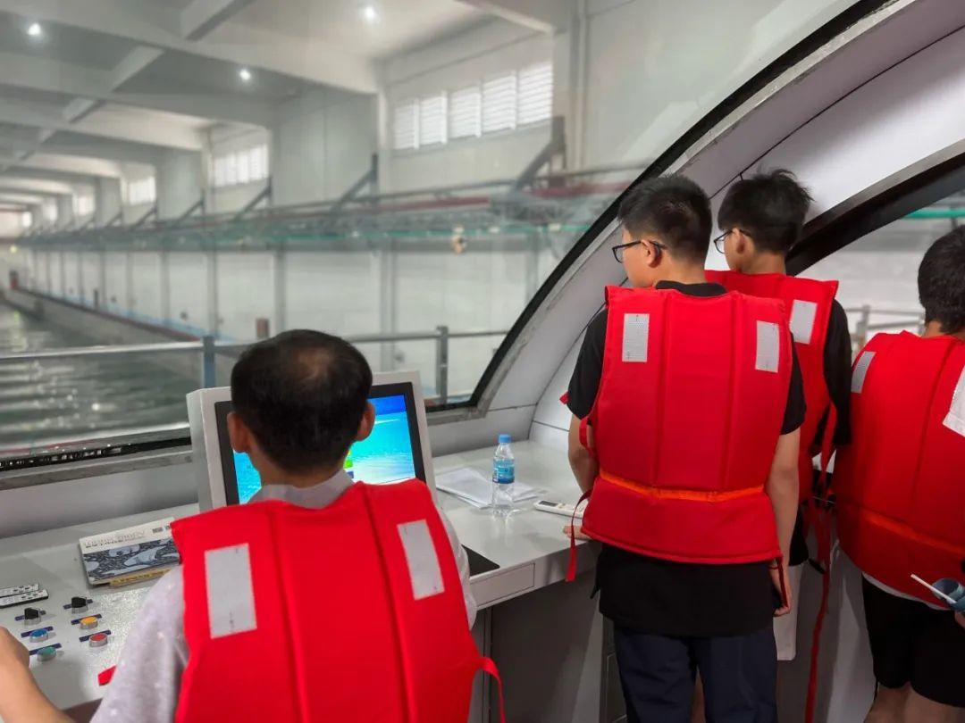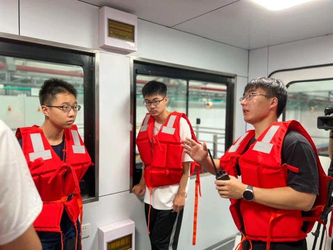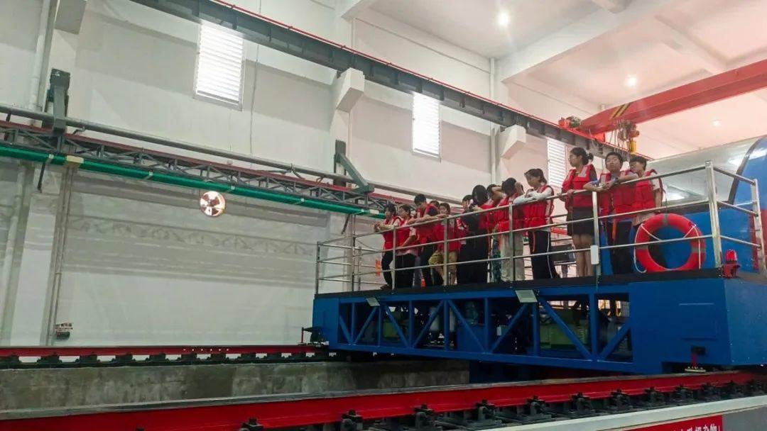 穿戴好救生衣,跟随讲解员登上由水池实验室王毅老师驾驶的电动拖车,学生们实地观看了船模水动力试验的全过程演示。博士生赵传凯详细向大家介绍了船模制作、仪器测量以及进行的试验全流程,带领同学们在118m的拖曳水池上“乘风破浪”。