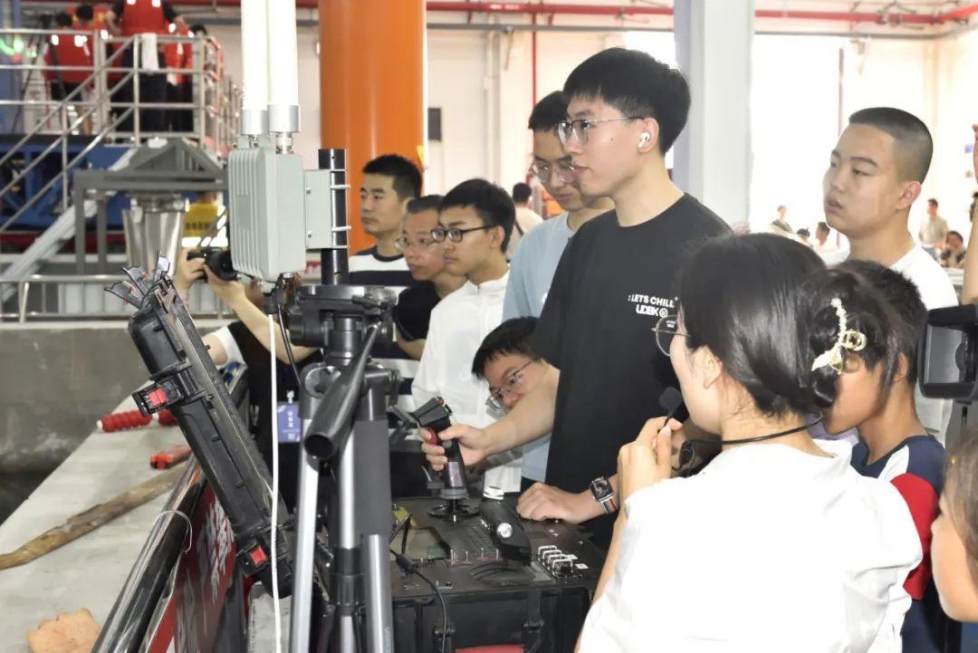 综合水池旁,水池实验室刘德丽老师向同学们演示无人船和水下机器人的操作。由威海校区教师团队研制的双体多功能无人船,在水面上进行自主巡航、自动避障等功能演示。