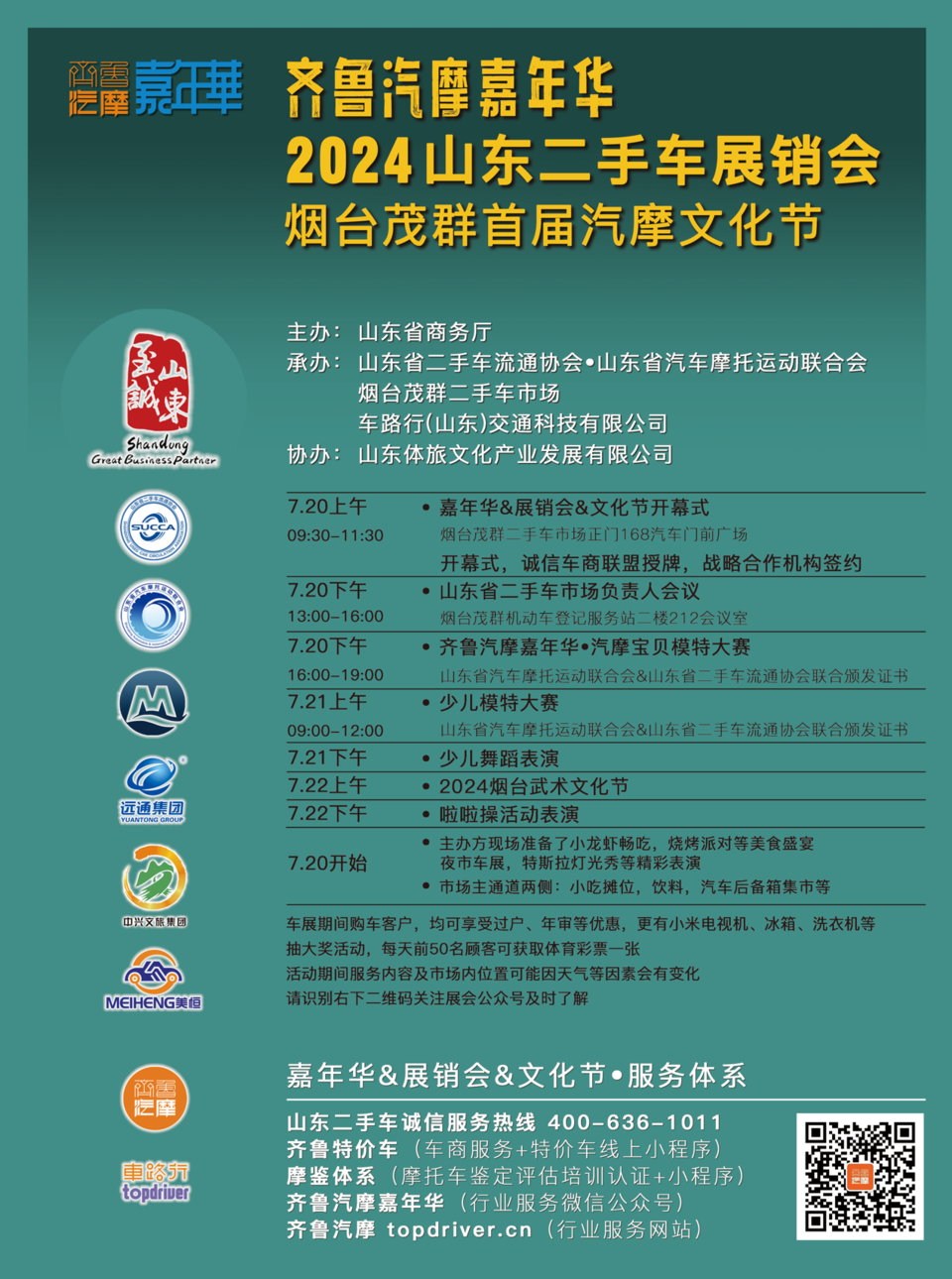 由山东省商务厅主办,山东省二手车流通协会、山东省汽车摩托运动联合会、车路行(山东)交通科技有限公司承办的齐鲁汽摩嘉年华•2024山东二手车展销会,将于7月至11月在山东省内多地多站陆续启动。