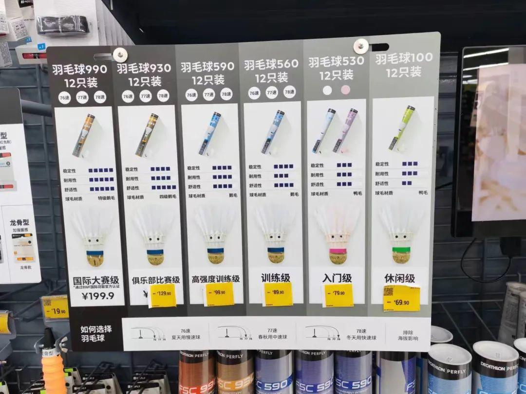 在综合运动超市迪卡侬,记者在羽毛球区,看到有6款天然羽毛球销售。有妈妈在帮助孩子挑选羽毛球装备,“我平时自己打球,用的是89.9元的这个鹅毛球,还算不错。”在天然羽毛球中,鹅毛球比鸭毛球,球感更好、更耐用、价格也更贵。迪卡侬鹅毛球中最便宜的,就是每桶89.9元,被标注为训练级。这里最贵的鹅毛球每桶199.9元,被标注为国际大赛级,而且通过了国际羽联官方认证。迪卡侬最便宜的入门级鸭毛球,每桶69.9元,是卖得最好的,货架上只剩寥寥几桶。