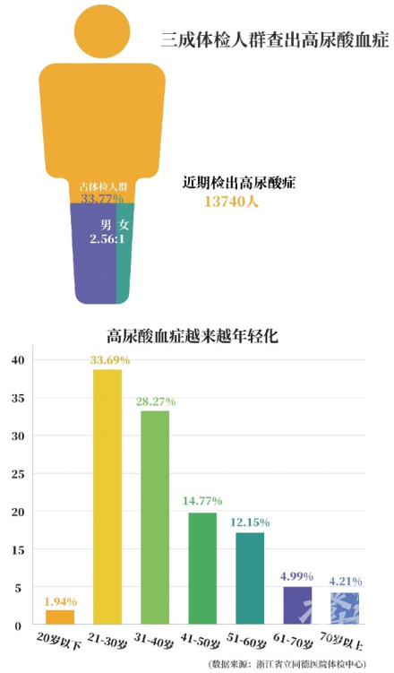 第四批全国老中医学术经验继承人、浙江省立同德医院肾病风湿科主任陈钦主任中医师表示,连日来,每天接诊将近20名高尿酸血症和痛风患者,其中九成是男性。此外,在他们医院体检的4万多名体检人员中,检出高尿酸13740人,占体检人群百分比33.77%,