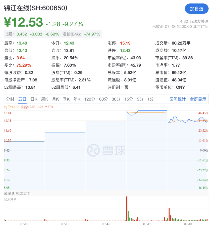 7月18日上午,上海锦江在线网络服务股份有限公司(以下简称“锦江在线”)一度跌停。截至7月18日收盘,股票价格为12.53元/股,跌幅9.27%,成交额达10.17亿元,总市值69.12亿元。