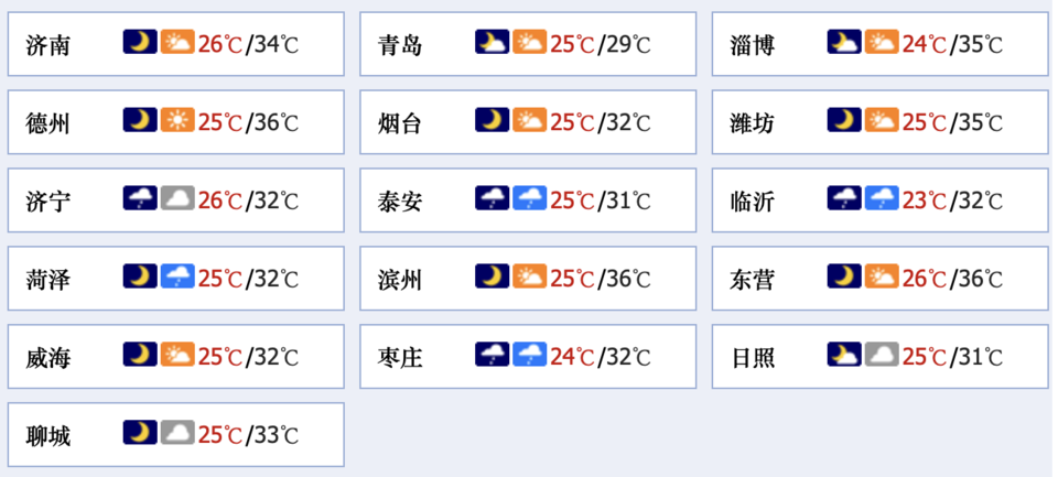 最高气温:德州、滨州、东营、济南北部和淄博北部36℃左右,鲁中山区、鲁南和南部沿海地区31℃左右,其他地区33℃左右。