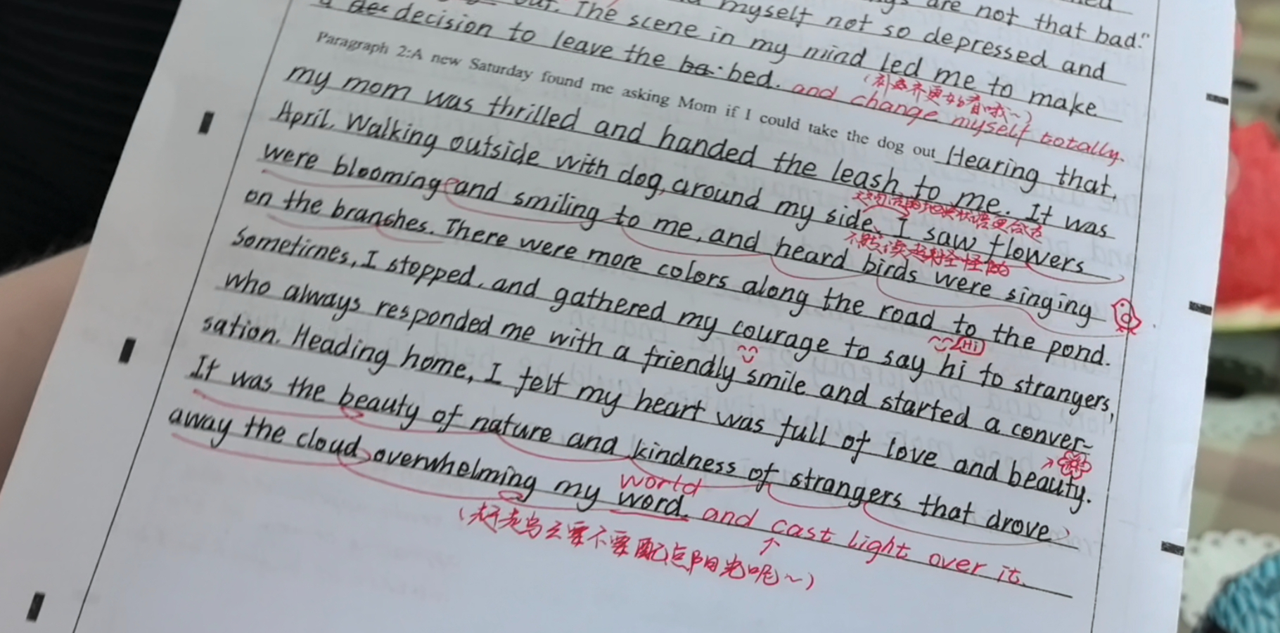 张艺瑄的英语老师有一个特别的教学方式,就是让大家互相改英语作文。张艺瑄的答题卡被密密麻麻写满了同学们的标注,有的标注是一朵小红花,有的是一只小黄鸭。但更引人注目的是他工整的笔记,连标点符号看上去都像打印的。