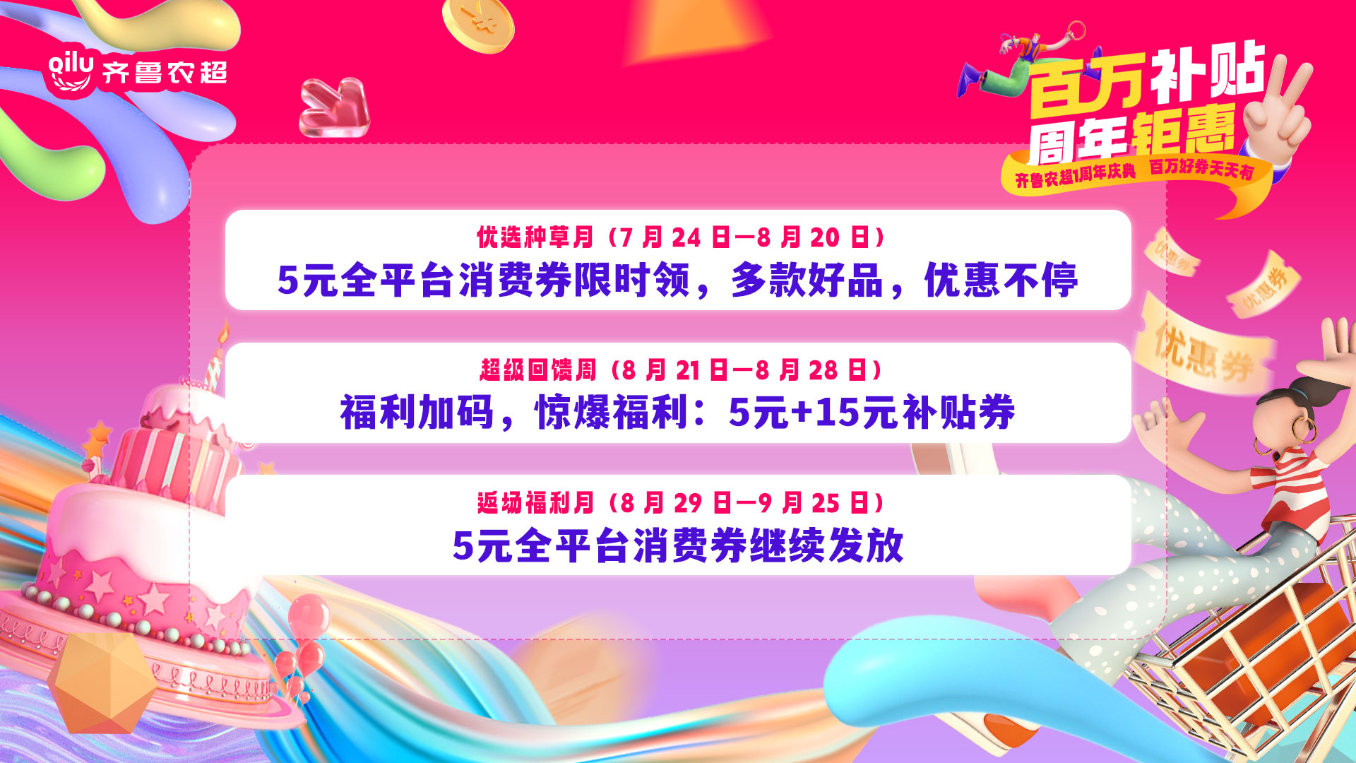 此次“齐鲁农超”周年庆典活动以“百万补贴 周年钜惠”为主题,通过发放平台优惠券的形式,直接为消费者提供百万优惠让利。活动分为3个阶段,分别为优选种草月(7 月 24 日—8 月 20 日)、超级回馈周(8 月 21 日—8 月 28 日)和返场福利月(8 月 29 日—9 月 25 日)。