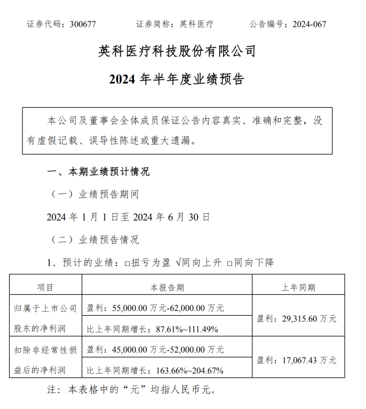 7月19日,英科医疗发布2024半年度业绩预告,预计2024年上半年业绩情况同向上升,归属于上市公司股东的净利润在5.5亿元至6.2亿元,同比增长87.61%至111.49%。扣除非经常性损益后的净利润盈利在4.5亿元至5.2亿元之间,比上年同期增长163.66%至204.67%。截至7月19日,英科医疗收盘价27.55,总市值在178.5亿。