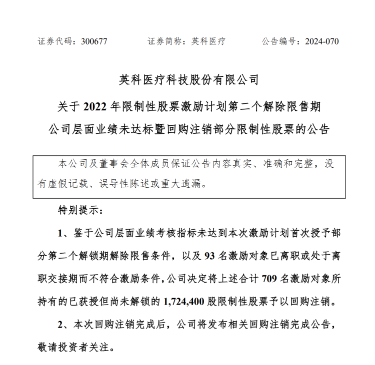 而根据最新消息,英科医疗发布关于调整限制性股票回购价格和回购注销部分限制性股票的公告。公告中提到,公司通过了《关于调整限制性股票回购价格和回购注销部分限制性股票的议案》,根据限制性股票激励计划相关规定,2022 年限制性股票激励计划限制性股票回购价格由 11.19元/股调整为 11.11 元/股。将符合激励条件709 名激励对象所持有的已获授但尚未解锁的 1724400 股限制性股票予以回购注销。