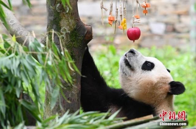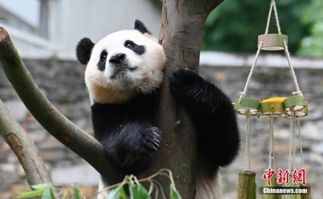 7月20日,海归大熊猫“福宝”在中国大熊猫保护研究中心卧龙神树坪基地迎来了它的四岁生日,这也是它回国后的第一个生日,众多粉丝专程前来为其庆生。据悉,大熊猫“福宝”2020年7月20日出生于韩国,今年4月返回中国后,它顺利适应了运输、隔离检疫、融入种群等环节,于6月12日与公众见面。图为大熊猫“福宝”在19日的集体生日会上。