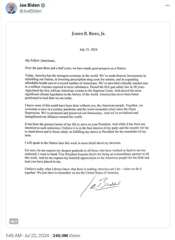 拜登退选公开信全文