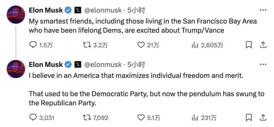 “我最聪明的朋友,包括那些住在旧金山湾区的人,他们原本一生都支持民主党,现在都对特朗普/万斯的搭档感到兴奋,”马斯克在X上写道,“我信奉一个能够最大限度提高个人自由和价值的美国。这曾经是民主党的使命,但现在钟摆已经摆向了共和党。