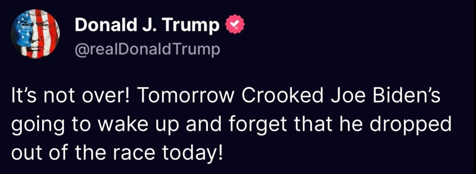 关于拜登退选,特朗普在最新的回应中说:“还没有结束。明天狡诈的拜登一觉醒来就会忘记他今天退出了竞选!”