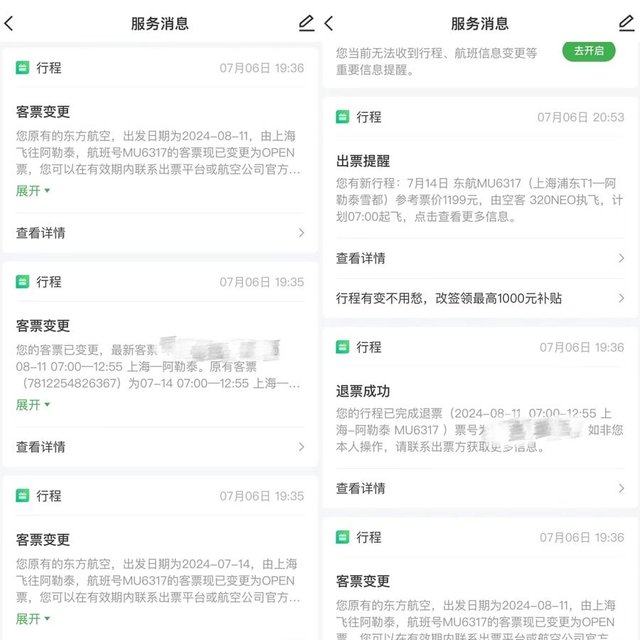 通过“航旅纵横”系统消息,记者看到,胡女士原先购买的,是7月14日从上海飞往阿勒泰的MU6317次航班,起飞时间为当天上午7时,票面价格为1661元。7月6日晚间,这张客票被变更为OPEN票,即无确定航班和起飞时间的“开口机票”,几乎在同一分钟内,OPEN票又被确定为一张8月11日起飞的客票。紧接着,这张机票再次被更改为OPEN票并成功退票。当晚21时许,服务消息中又出现“出票提醒”,新机票依然是7月14日起飞的MU6317次航班,只是票面价格变更为1199元,较此前降低了400余元。