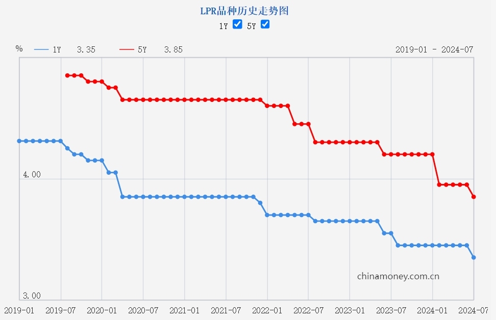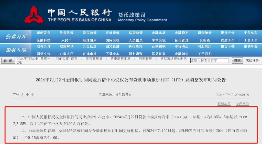 同日,央行公布了7月LPR报价,2024年7月22日LPR为:1年期LPR为3.35%,5年期以上LPR为3.85%。1年期和5年期利率均下调10个基点。