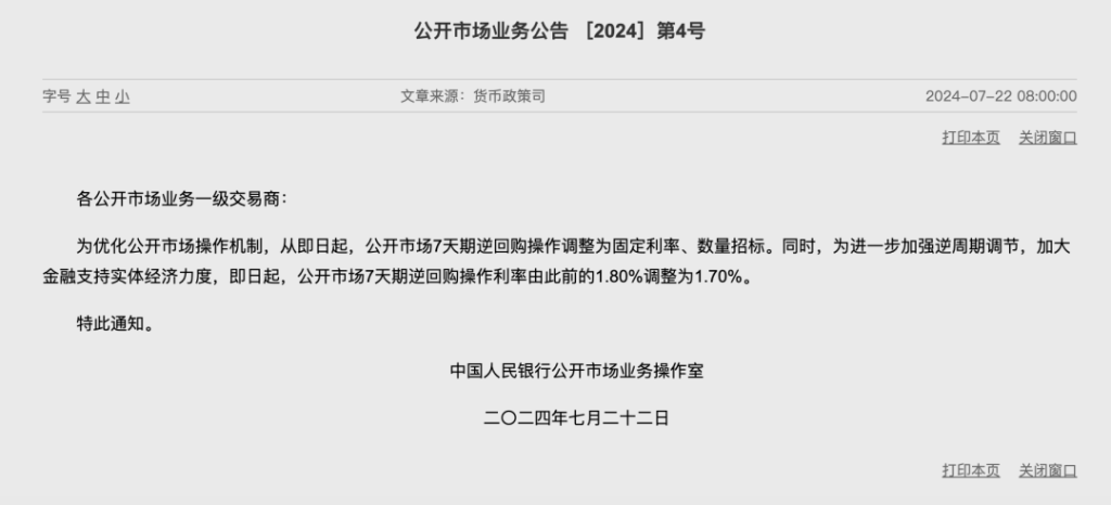 除了招标方式调整,本次公开市场7天期逆回购操作利率还由前次的1.8%降至1.7%,为2023年8月以来首次调整。