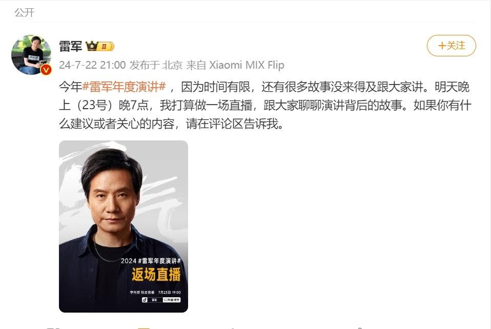 日前,小米公司CEO雷军在社交媒体上宣布,他将于7月23日晚7点举行“2024年度演讲返场直播”。