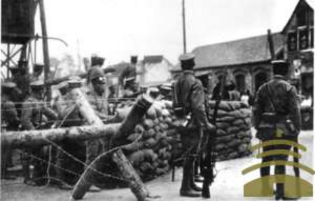 “五三惨案”时期,在济南街头垒筑阵地的日军士兵