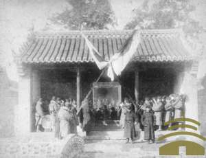 日军在威海卫东门内大成殿前祝捷中日甲午战争时期,日军攻陷威海卫,第二军在威海卫东门内大成殿门前祝捷。