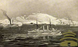 甲午战争中,在威海卫炮火掩护下的中国舰队。