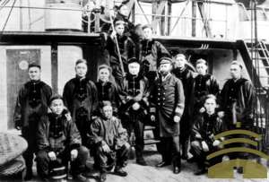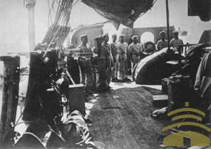 “致远”号装甲巡洋舰官兵合影。1894年中日海军黄海大战中,被敌鱼雷击中,管带邓世昌以下之全舰管兵大多壮烈殉国。