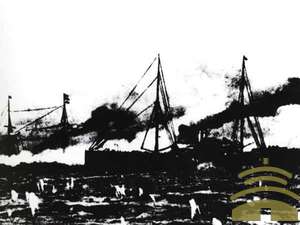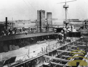 在黄海大战中北洋舰队“镇远”号在旅顺船坞抢修。