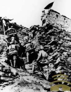 图为山东省潍县战役,勇士们把胜利的旗子插在潍县城头(1948年4月12日)。
