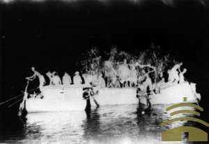 人民解放军在鲁西南董口至临濮集一线三百里宽的地区,击破河防守敌,渡过了天险黄河。图为我军渡黄河的情形(1947年6月30日晚)。