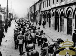 图为1948年,济南解放后,华东野战军某部官兵进入城区。