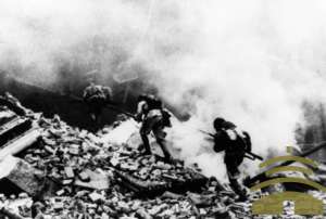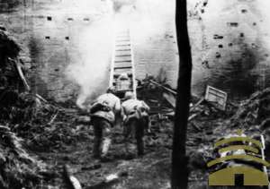 图为解放军的勇士们架梯爬上城墙(潍县战役1948年4月12日)。