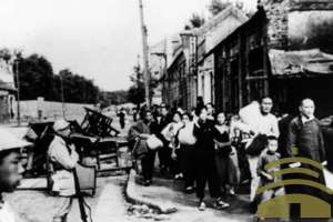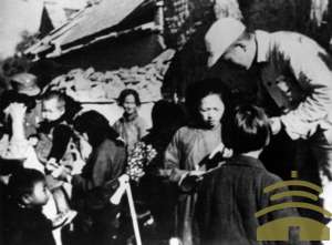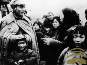 图为1948年9月济南解放后,我军战士给蒋军家属发遣送证和路费让他们回家。