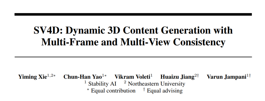 SV4D技术论文也同步发表,研究团队由Stability AI和东北大学学者组成,其中详细解读了该模型的框架结构、优化策略、测评结果等。