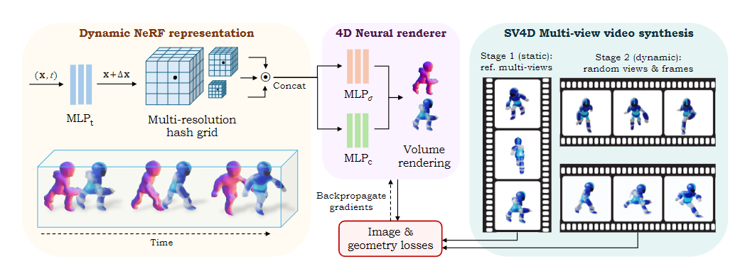 在框架的优化上,SV4D使用参考多视图图像的第一帧,优化由多分辨率哈希网格以及密度和颜色多层感知机(MLP)表示的静态NeRF,然后解冻时间变形MLP,并使用随机采样的视图和帧来优化动态NeRF。