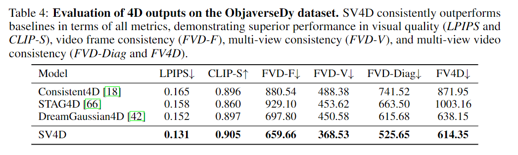在ObjaverseDy数据集上的4D输出评估中,SV4D在所有指标方面优于基线,在视觉质量(LPIPS和CLIP-S)、视频帧一致性(FVD-F)、多视图一致性(FVD-V)和多视图视频一致性(FVD-Diag和FV4D)方面都击败了此前的模型。