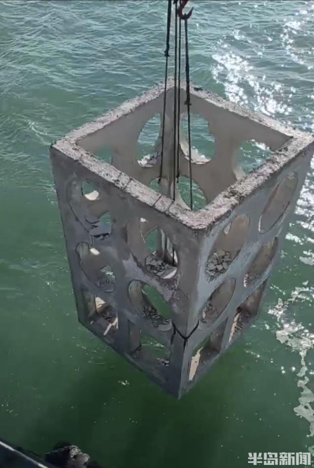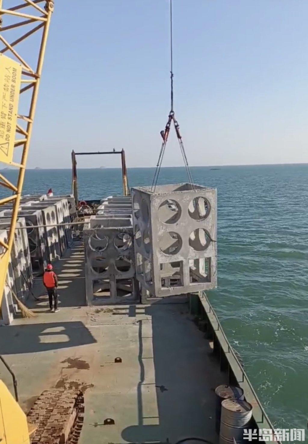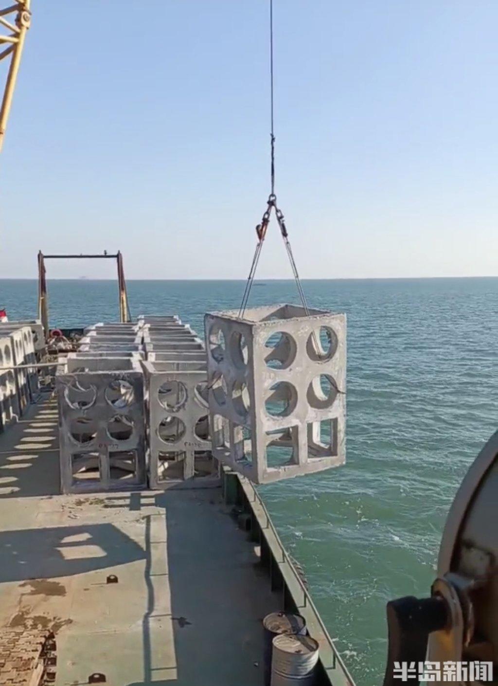2022年10月,当第一批经过特殊预制的鱼礁运抵四十里湾海岸,随着大型吊车吊着第一块鱼礁划过海空,穿过海平面缓缓落入海底泥沙之上,耕海1号周边“海底荒漠”治理号角正式吹响了。之后,各类鱼礁源源不断运往这里,投放时间一直持续到2023年2月。