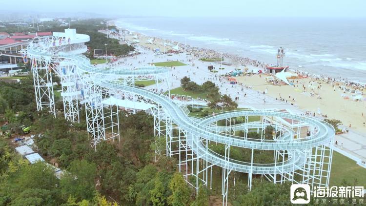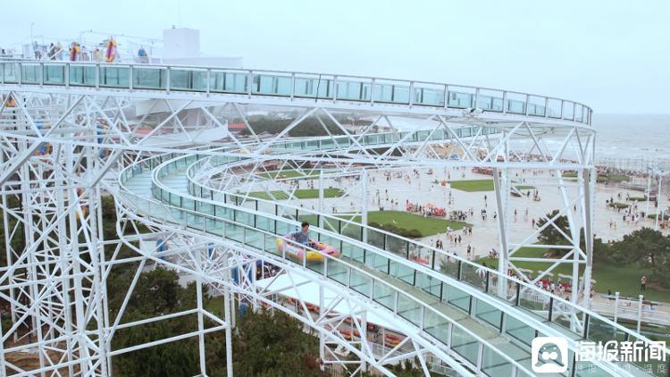 远远望去,一道晶莹剔透的空中漂流水滑道犹如一条巨龙蜿蜒盘旋,在阳光下熠熠生辉。随着工作人员的指引,游客们乘坐电梯抵达26米高的观景塔。站在塔顶,整个万平口的滨海美景尽收眼底,海风拂面,令人心旷神怡。