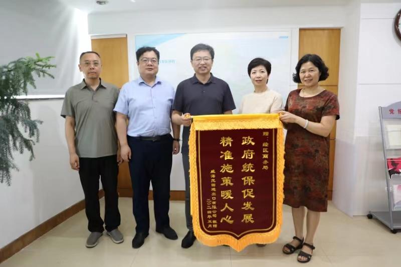 7月24日,威海茂田进出口有限公司(以下简称“威海茂田”)负责人将一面印有“政府统保促发展 精准施策暖人心”的锦旗送到威海经开区商务局,对商务局积极支持小微企业出口、保障企业合法权益等做法表示感谢。